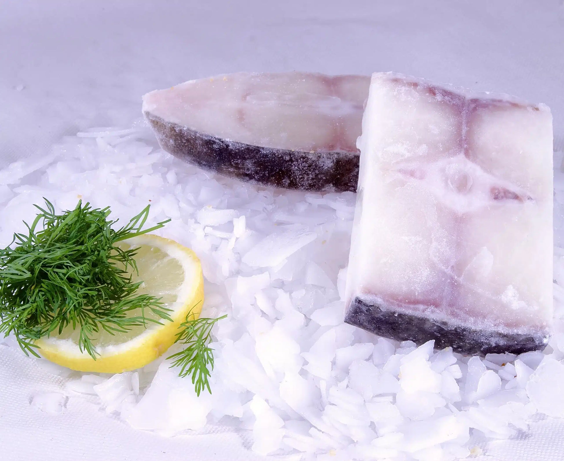 Villfanget kveite i skiver - kortreist fra Atlanterhavet. Kveiten er linefisket noe som sikrer en delikat farge og fast konsistens. Skivene er ca. 1 cm tykke med et bein i midten.